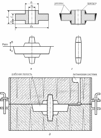 г) эскиз стержня; д) вертикальный разрез литейной формы