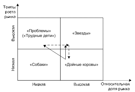 Для решения этой задачи используют матрицу Бостонской консультационной группы (сокращённо матрица БКГ). Эта матрица позволяет определить место товара на рынке (рыночную позицию фирмы) в зависимости от принадлежащей ему относительной доли (отношение доли товара данной фирмы к соответствующей доле основного конкурента) и темпов роста рыночного спроса. Это самая популярная схема портфельного анализа бизнеса компании, позволяющая принимать важные решения в области ассортиментной политики фирмы, выбирать ей свои стратегические единицы бизнеса. Любое предприятие хотело бы работать на растущем рынке и предлагать товары, захватившие его наибольшую долю.