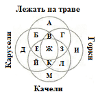 Каждый из этих кругов обозначает какое-нибудь занятие в парке. Буквы обозначают людей. Найди человека, который любит кататься с горки и на качелях, но при этом не любит кататься на карусели и валятся на траве?