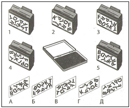 В магазине канцелярских товаров «Чернильница» перепутали все штампы и образцы оттисков. Помоги подобрать каждому штампу соответствующие оттиски и навести в магазине порядок. Ответ представь в виде: цифра – буква.