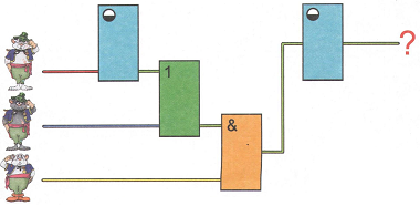 Какая мышь получится на выходе из этой комбинации волшебных коробок, если на красном входе будет белая мышь, на синем – серая, а на жёлтом – снова белая?