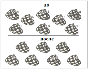 Вика захотела купить новую сумочку. Она отправилась в магазин «Сумки и сумочки». Угодить капризной девочке весьма сложно: она по очереди пересмотрела все имеющиеся сумочки, возвращая их на витрину в произвольном порядке. Вот так выглядела витрина до и после прихода Вики. Какую сумочку купила девочка?