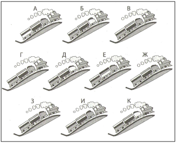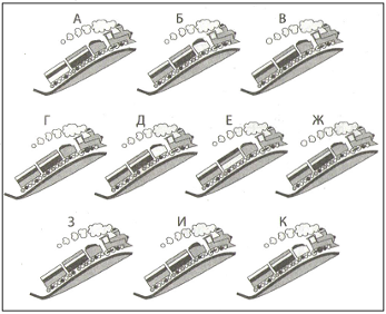 Аня рисует иллюстрации к детской книжке «Вперёд на всех парах». Когда её попросили сделать две одинаковые друг другу картинки, Аня точно скопировала одну из иллюстраций. Но после этого она, к сожалению, уронила стопку картинок, и они перепутались. Помоги найти Ане пару одинаковых картинок.