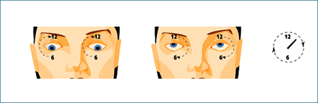 Вдыхая, опустить глаза вниз и затем медленно поворачивать их по часовой стрелке, остановившись в самой верхней точке (на 12-ти часах). Не задерживаясь, начать выдох и продолжить поворот глаз по часовой стрелке вниз (до 6 часов). Для начала достаточно одного круга, постепенно можно довести их количество до трех кругов (через две-три недели) При этом нужно, не задерживаясь после первого круга, сразу начать второй. Закрыть после выполнения упражнения, глаза на несколько секунд.