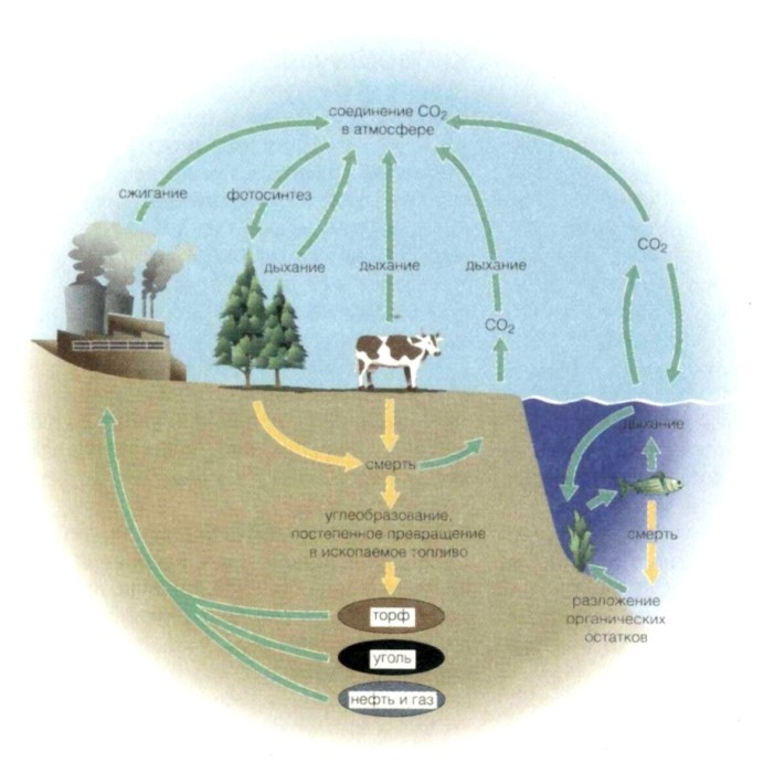 Элементарный углерод нахо дится в постоянном движении. Газообразный диоксид углерода (С02) спервапревращается в простые сахара путем фотосинтеза в зеленых растениях. Они расщепляются (при дыхании)и поставляют организму энергию, причем С02 снова возвращается в атмосферу Животные, питающиесярастениями, при метаболизме также преобразуют сахара и выделяют С02. Геологические процессыоказывают влияние на баланс углерода в масштабах земного шара: углерод исключается из кругооборота,когда накапливается в таких ископаемых, как уголь, нефть и газ. И наоборот, большие количества диоксидауглерода выделяются в атмосферу при сжигании этих горючих материалов.