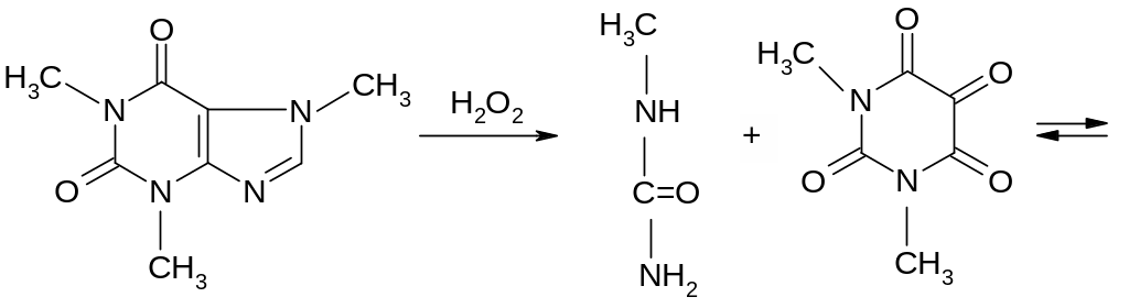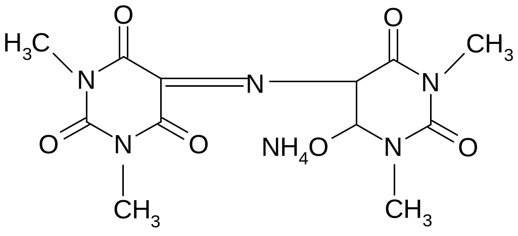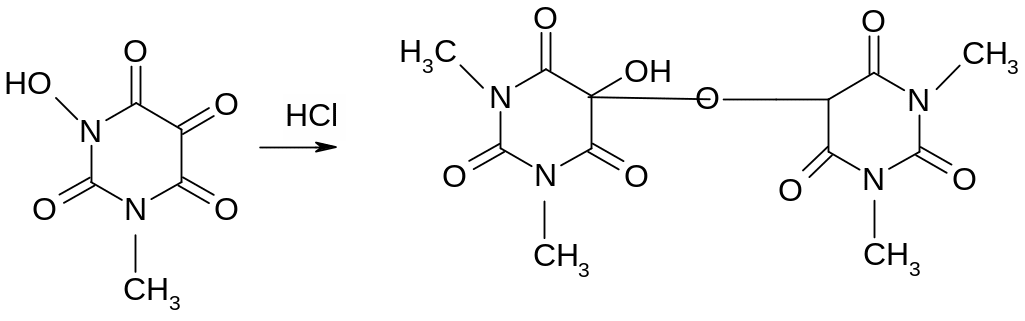 Эта реакция основана на разрушении молекулы пурина при нагревании с окислителем (перекисью водорода, бромной водой, азотной кислотой). Происходит образование смеси производных аллоксана и его изомера диалуровой кислоты. Взаимодействуя между собой, они образую метилированные производные аллоксантина, которые под действием избытка раствора аммиака приобретают пурпурно-красное окрашивание. Окраска обусловлена появлением аммонийной соли метилированного производного пурпуровой кислоты.