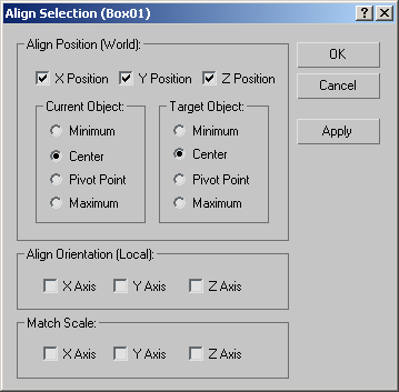 Объекты изменят свое положение в сцене сразу же после того, как вы зададите необходимые настройки в окне Align Selection (Выравнивание выделенных объектов). Однако если выйти из этого окна, не нажав кнопку ОК или Apply (Применить), объекты вернутся в исходное положение.