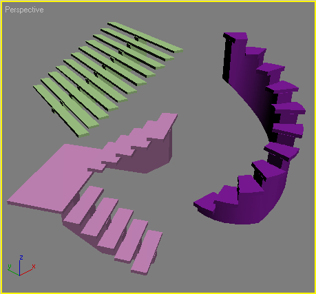 Следующая группа объектов — Stairs (Лестницы) — также является необходимым инструментом для проектирования архитектурных сооружений (рис. 2.10). В 3ds max можно создавать четыре типа лестниц: L-Type (L-образная), Straight (Прямая), Spiral (Винтовая) и U-Type (U-образная). Объекты Stairs (Лестницы) могут быть Open (Открытые), Closed (Закрытые) и Box (С основанием). Отдельно регулируется наличие перил с правой и левой сторон при помощи параметра Hand Rail (Перила), их высота — Rail Height (Высота перил) и расположение относительно ступенек — Rail Path (Путь перил), а также высота — Thickness (Толщина) — и ширина ступенек — Depth (Глубина). Для спиральной лестницы дополнительно указывается Radius (Радиус), наличие опоры — Center Pole (Центральная опора), а параметр Layout (Расположение) задает направление такой лестницы по часовой стрелке и против нее. В группу AЕС Extended (Дополнительные объекты для архитектурных, инженерных и конструкторских работ) входят объекты Foliage (Растительность), Railing (Ограждение) и Wall (Стена). Объекты Railing (Ограда, перила) и Wall (Стена) как и описанные выше объекты Doors (Двери) и Windows (Окна), применяются в архитектурном моделировании.