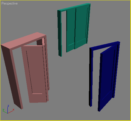 Начиная с 3ds max шестой версии, в программе появились группы объектов AЕС Extended (Дополнительные объекты для АИК), Doors (Двери), Windows (Окна), Stairs (Лестницы) и др. Как нетрудно догадаться, эти объекты служат для проектирования архитектурных сооружений. В версиях 3ds max более ранних, чем шестая, отсутствовали такие необходимые для архитектурного проектирования объекты, как окна и двери. Этот недостаток можно было устранить подключением бесплатных модулей Doors (Двери) и Windows (Окна), разработанных фирмой-производителем 3ds max — компанией Discreet. В шестой версии 3ds max Doors (Двери) и Windows (Окна) были добавлены в стандартный список объектов. Настройки этих объектов совпадают с настройками вышеупомянутых подключаемых модулей для 3ds max четвертой и пятой версий. Группа объектов Doors (Двери) (рис. 2.8) позволяет создать три типа дверей — Pivot (Закрепленные на оси), Sliding (Раздвигающиеся) и BiFold (Складывающиеся). Первые напоминают обычные входные двери, вторые — двери купе, а третьи — автобуса. Можно создавать одинарные или парные двери при помощи параметра Double Doors (Двойные дверцы), регулировать размер дверной коробки — параметры Width Frame (Ширина рамы) и Depth Frame (Глубина рамы), самих объектов — Height (Высота), Width (Ширина), Depth (Глубина) и даже толщину стекол — Glass Thickness (Толщина стекла). Параметр Open (Открытие) позволяет указать, насколько двери открыты.