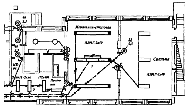 Как пример, на рис. 2.11 даны размещение ОП и схема групповой сети освещения в ячейке детского сада-яслей, состоящей из раздевальной, групповой и спальни.