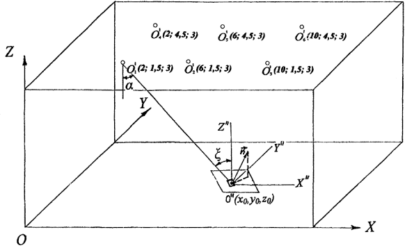 где xi, yi, zi - координаты i-го светильника в декартовой системе координат с центром в одном из углов помещения или ячейки (рис. 1.7);