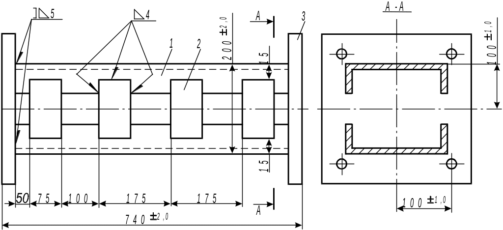 Швеллер № 20, дет.1, 2 шт., L = 700 мм, сталь ВСт3кп, ГОСТ 380-88. Установить допуск на длину.