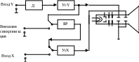 Она состоит из электронно-лучевой трубки ЭЛТ делителя напряжения Д, усилителей вертикального и горизонтального отклонения Yс , V и Ус. X и блока развертки БР.