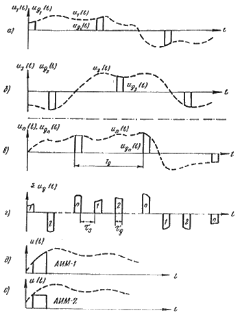 Рис. 3. Формирование группового АИМ-сигнала (а—г) и форма импульсов АИМ-1 (д) и АИМ-2 (е).