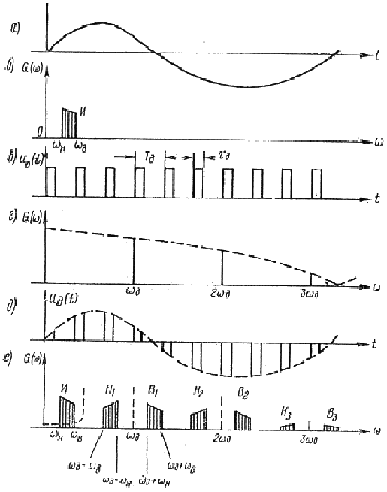 Pиc.1. Непрерывный модулирующий сигнал (а) и его спектр (б), импульсная несущая (в) и ее спектр (г), дискретизированный сигнал (д) и его спектр (e)