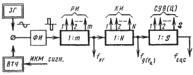 Как правило, в качестве делителей частоты применяют регистры на выходах которых формируются разрядные РИ, канальные КИ и сигнальные СУВ (цикловые Ц) импульсные последовательности. Разрядные импульсы используются для формирования разрядов кодовых групп, канальные - для управления ключами АИМ на передаче и временными селекторами ВС на приеме, а сигнальные - для дискретизации каналов передачи СУВ. Различие в построении ГО передающей и принимающей оконечных станций заключается лишь в источнике тактовой частоты. На передающей станции эту частоту получают от задающего генератора ЗГ с кварцевой стабилизацией частоты, а на принимающей станции - от выделителя тактовой частоты ВТЧ. Формирователь импульсов ФИ преобразует синусоидальное колебание в импульсную последовательность.