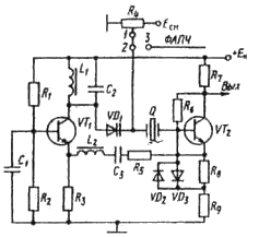 При построении перестраиваемых ЗГ на интегральных схемах для обеспечения управления частотой ЗГ требуется сложная схема подстройки. Поэтому ЗГ первичных ЦСП и более высоких порядков строят в основном на дискретных элементах. Рассмотрим типичный пример реализации ЗГ на дискретных элементах. Упрощенная принципиальная схема такого ЗГ представлена на Рис. 6. Это двухкаскадный усилитель с положительной обратной связью. Режим по постоянному току первого каскада обеспечивается резисторами R1, R2, R3, второго - резисторами R6 ... R9. В цепи прямой связи между каскадами включен кварцевый резонатор Q и подстроечный элемент - варикап VD1. Положительная обратная связь осуществляется через контур L2, С3, R5. Резонансные свойства первого каскада обеспечиваются L1, С2. Амплитуда переменного напряжения, приложенного к базе VT2, ограничивается диодным ограничителем VD2, VD3. Этим обеспечивается стабилизация амплитуды выходного сигнала ЗГ. Смещающее напряжение Есм, приложенное к варикапу, может изменяться потенциометром R4 или регулироваться напряжением с ФАПЧ при работе внешней синхронизации ЗГ.