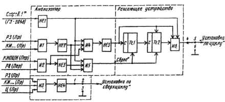 Требуемая точность установки фазы ГОпер обеспечивается стробированием канальных и разрядных интервалов тактовой частотой (элементы И1, И2, НЕ1-НЕЗ). В случае расхождения фаз сравниваемых импульсных последовательностей ГОпер и ГОпр анализатор вырабатывает импульсы "Установка по циклу", которые предварительно поступают на вход решающего устройства. Решающее устройство, представляющее собой 2-разрядный счетчик (Тг1 и Тг2), играет роль накопителя и служит для повышения помехозащищенности работы ФСУ. Действительно, лишь третий импульс с выхода анализатора проходит через схему стробирования И6 и поступает на шину "Установка по циклу" ГОпер, сбрасывая триггеры ДР и ДК в исходное состояние. После установки заданного временного положения импульсных последовательностей ГОпер и ГОпр происходит сброс триггеров накопителя Тг1 и Тг2 импульсом, поступающим от элемента сброса И5.