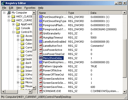 Задержка при открытии подменю может действовать на нервы. Для избавления от неё нам понадобится редактор реестра. Выполните команду regedit.exe. Затем найдите нужную ветку и параметр и введите правильное значение, как на скриншоте (см. выше).