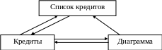 «Кредиты» - для счетов идет таблица с полями, Номер кредита, Назначение, Сумма кредита, Название клиента.