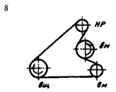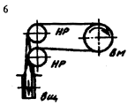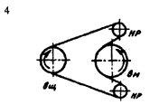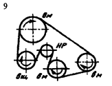 Примечания: 1. Схемы 1, 3, 5 — передачи с двумя шкивами; схемы 2, 4, 6, 7, 8, 9 — передачи с натяжными или направляющими роликами. 2. Обозначения: вщ — ведущий шкив; вм — ведомый шкив: HP — натяжной или направляющий ролик |