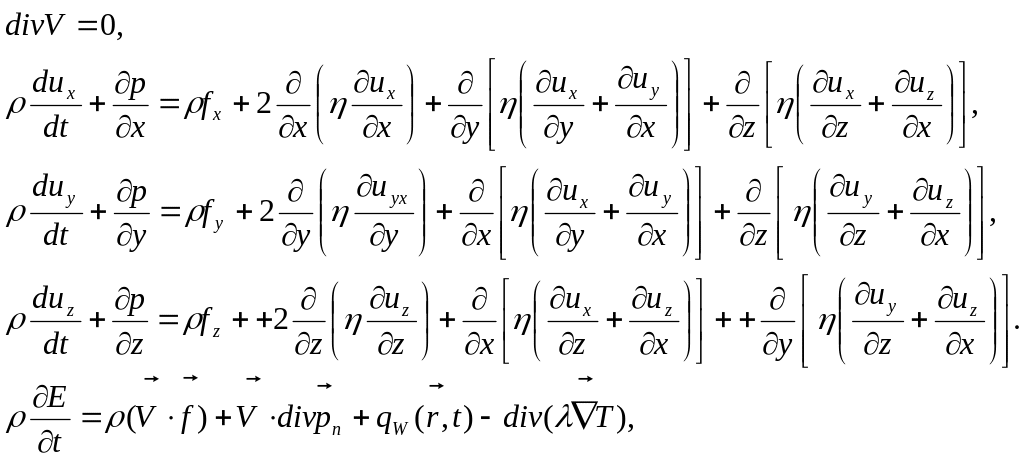 Для несжимаемой среды система имеет более простой вид. Уравнение неразрывности переходит в уравнение несжимаемости (1.4.4), уравнения Навье-Стокса и энергии существенно упрощаются, уравнение состояния становится не нужным:
