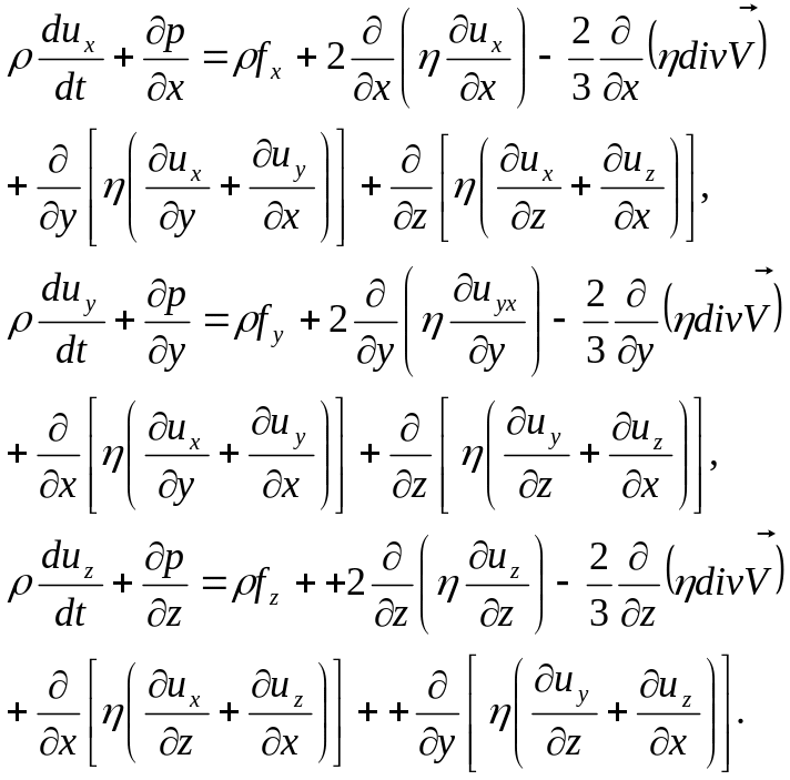 Подставляя (1.6.24) в (1.6.23) и используя уравнение неразрывности (1.4.13), получим систему уравнений движения для вязкой сжимаемой жидкости, которая носит название системы уравнений Навье-Стокса:
