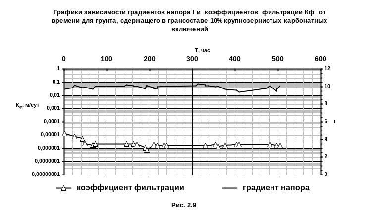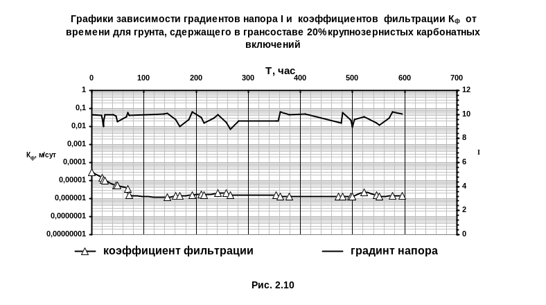 Водопроницаемость грунта определялась при минимальных сжимающих нагрузках σ = 0,035 МПа. Продолжительность опытов составляла 20-25 суток.
