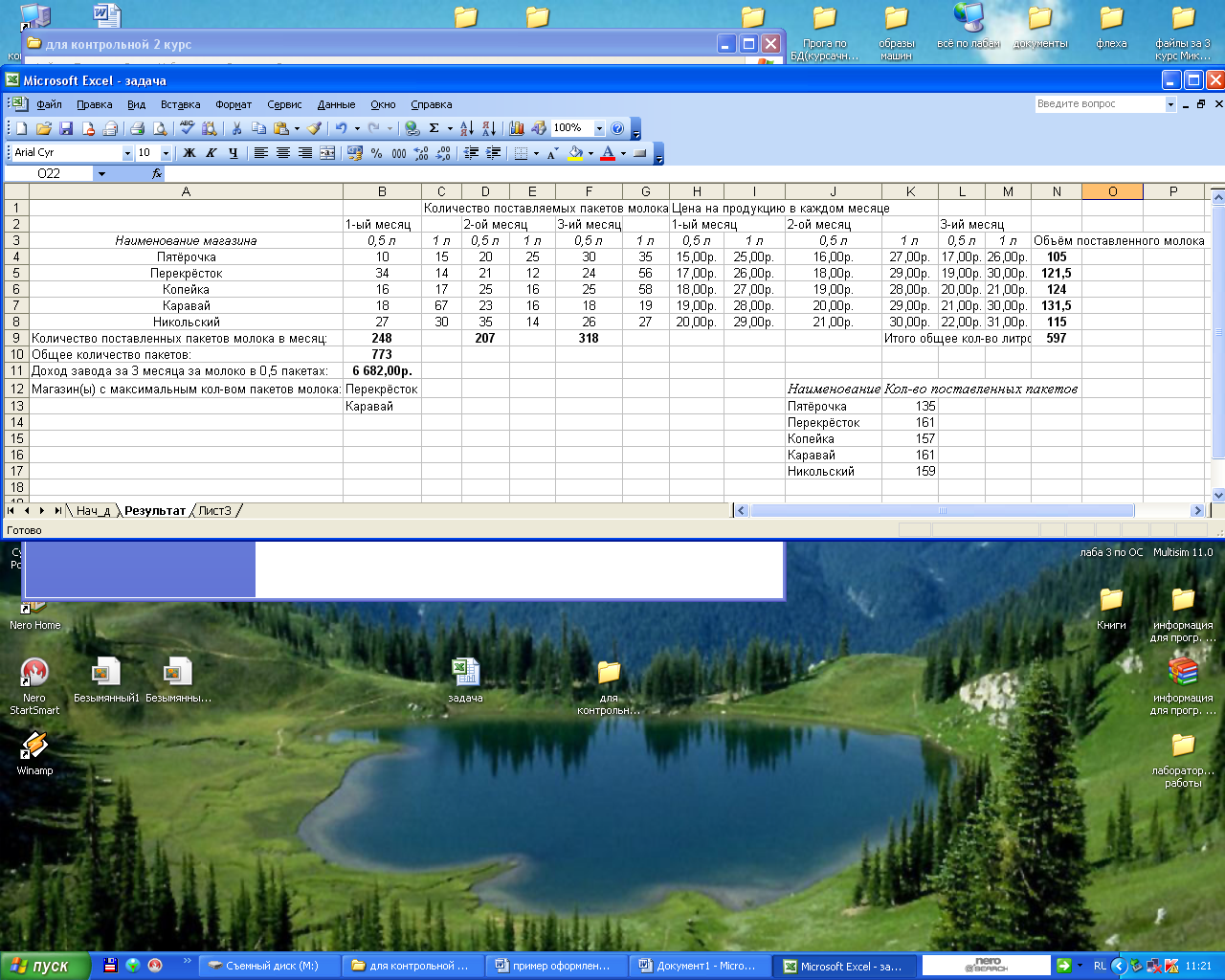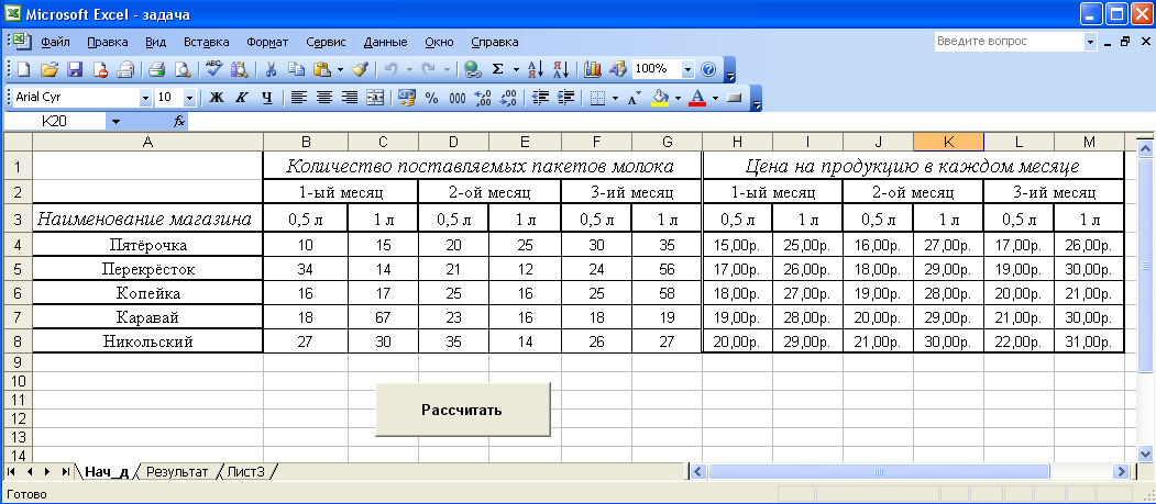 Написать программу на языке VBA, которая вводит исходные данные, выполняет расчеты и выводит на экран: исходные данные в виде таблицы, где указаны наименование магазинов, количество пакетов молока емкостью 0,5 и 1 литр соответственно, ежемесячно поставляемых в каждый магазин, цены на продукцию в текущем месяце;