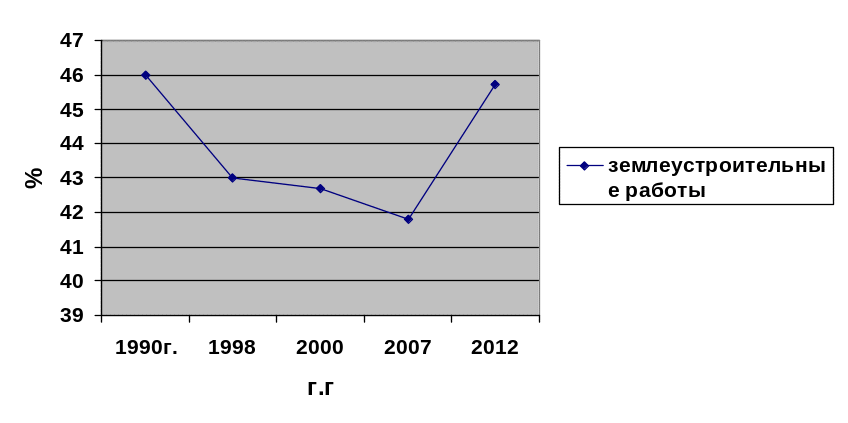 Вывод: Таким образом, из данной диаграммы видно, что в 1990 году землеустроительные работы ввелись активно и показывали 46% от всех работ а с 1998 по 2007год показатели землеустроительных работ резко снизились. Такой резкий спад показателей объясняется с распадом Советского Союза, так как после него новой Российской Федерации было трудно восстановиться. Но усилиями и активными работами российских землеустроителей уже в 2012 году показатели были ближе к 46 % и начинает расти уже в новой России.