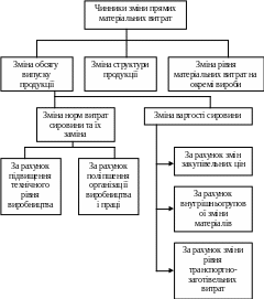 Подальший аналіз матеріальних витрат вимагає виявлення динаміки та чинників зміни питомої ваги певного елемента у загальному обсязі матеріальних витрат. Характерні чинники зміни матеріальних витрат показані на рис. 8.2.