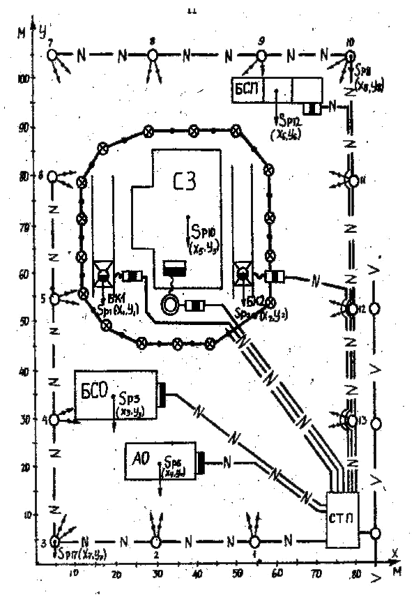 Координаты X и Y теоретического центра малоизменяющихся электрических нагрузок S1, S2,… отдельных участков СП (см. рисунок) определяется по формулам: