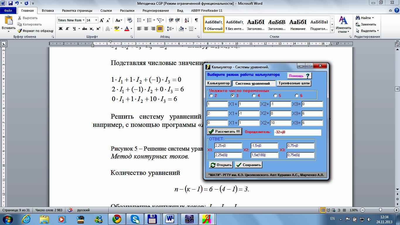Решить систему уравнений можно используя численные методы, например, с помощью программы «Калькулятор» (рисунок 1.4):