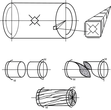 В случае кручения деревянных валов с продольным расположением волокон (рисунок 8 в) трещины разрушения ориентированы вдоль образующей, поскольку древесина плохо сопротивляется действию касательных напряжений вдоль волокон.