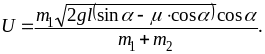 Пример 9. Ящик массой m1 = 20 кг соскальзывает по лотку длиной l = 2 м с коэффициентом трения µ=0,1 на неподвижную тележку с песком и застревает в нем. Тележка с песком массой m2 = 80 кг может свободно (без трения) перемещаться по рельсам в горизонтальном направлении. Определить скорость и тележки с ящиком, если лоток наклонен под углом a = 30° к рельсам.