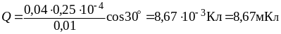 Пример 10. Квадратная проволочная рамка со стороной а = 5 см и сопротивлением R = 10 мОм находится в однородном магнитном поле (В = 40 мТл). Нормаль к плоскости рамки составляет угол α = 30° с линиями магнитной индукции. Определить заряд Q, который пройдет по рамке, если магнитное поле выключить.