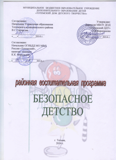 Мы полагаем, что все эти проблемы безопасности детей требует воспитания более высокого уровня культуры людей и детей, в частности, в области безопасности дорожного движения, повышения ответственности каждого человека за свои действия. Профилактика безопасности школьников включает в себя работу с детьми и тесное сотрудничество с родителями, педагогами, воспитателями. В связи с этим педагогами МБОУ ДОД «Тотемский ДДТ» разработана целевая воспитательная программа «Безопасное детство».
