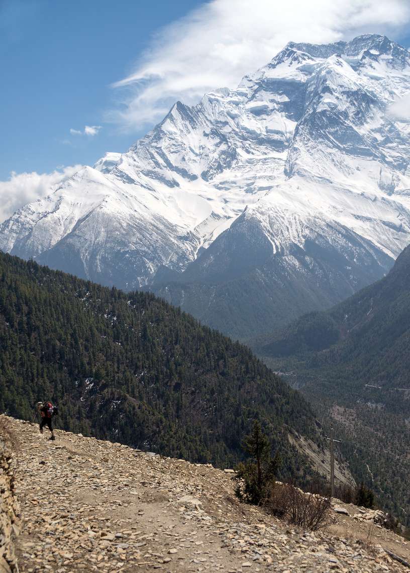 Далее тропа идёт траверсом склона, причудливо извиваясь вслед за рельефом. Позади стена Писанга и Аннапурна-2, очень живописные на фоне синего неба. Через 3 км после прохождения притока по навесному мосту начался длинный крутой подъём серпантином к селению Гьяру с набором 500м. Высота уже приличная – 3760м, некоторым подъём даётся с большим трудом.
