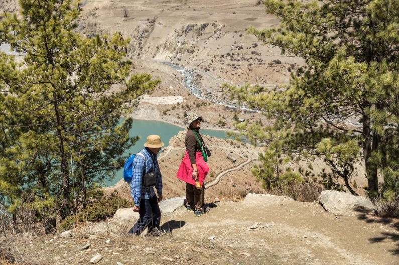 В 8 часов выходим из Дукур-Покхари. Далее у нас 2 варианта пути на Мананг – либо по нижней дороге, либо по верхней тропе через Верхний Писанг. Второй вариант более трудный, с большим набором высоты, но и гораздо более интересный! Без колебаний выбираем его. Сразу за Дукур-Покхари сходим с дороги направо на тропу, проходим мимо полупересохшего озерца и по мосту через Марсиангди на левый берег. Отсюда начинается плавный набор высоты до Верх.Писанга. Проходим мимо цветущих сакур. Сам посёлок построен на крутом склоне.