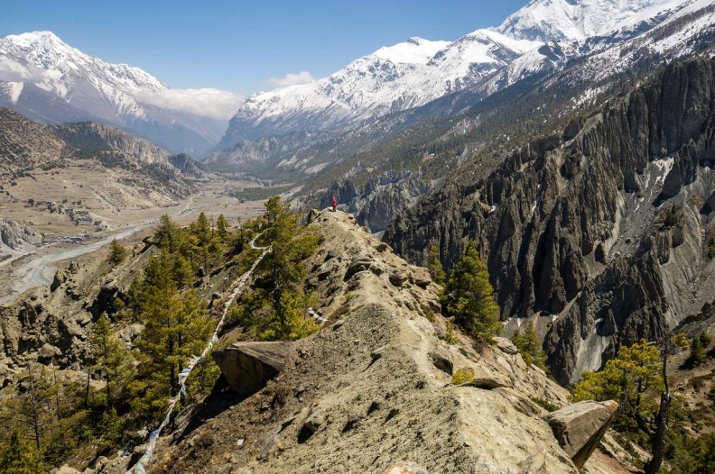 В 10-00 мы пришли в Мананг (3540 м). Скинули рюкзаки в гестхаузе и в 11-40 пошли на смотровой холм у подножья Аннапурны-4 (Chongkor view point). Тропа спускается из Мананга к подвесному мосту через Марсиангди, затем поднимается на моренный вал, за которым внизу открывается ледниковое озеро Гангапурна. Оно наполняется тающим ледником, сползающим между Аннапурной-4 и Гангапурной. Виды очень впечатляют. Поднимаемся по моренному валу, огибая справа высокие отвесные скалы и осыпь. Затем тропа переходит на склон холма, поднимаясь серпантином, местами лежит нерастаявший снег. Набрав 300м высоты, попадаем на вершину холма, здесь чайный домик и вездесущие гирлянды флажков с молитвами. Красивые виды на все 360 градусов. Чуть выше, на 4000м, уже начинаются заснеженные склоны Аннапурны. Здесь ещё ранняя весна, лиственные деревья стоят с голыми ветвями в снегу. Изрядно пощёлкав фотоаппаратом, спускаемся к озеру. Вода +4, сразу сводит ноги.