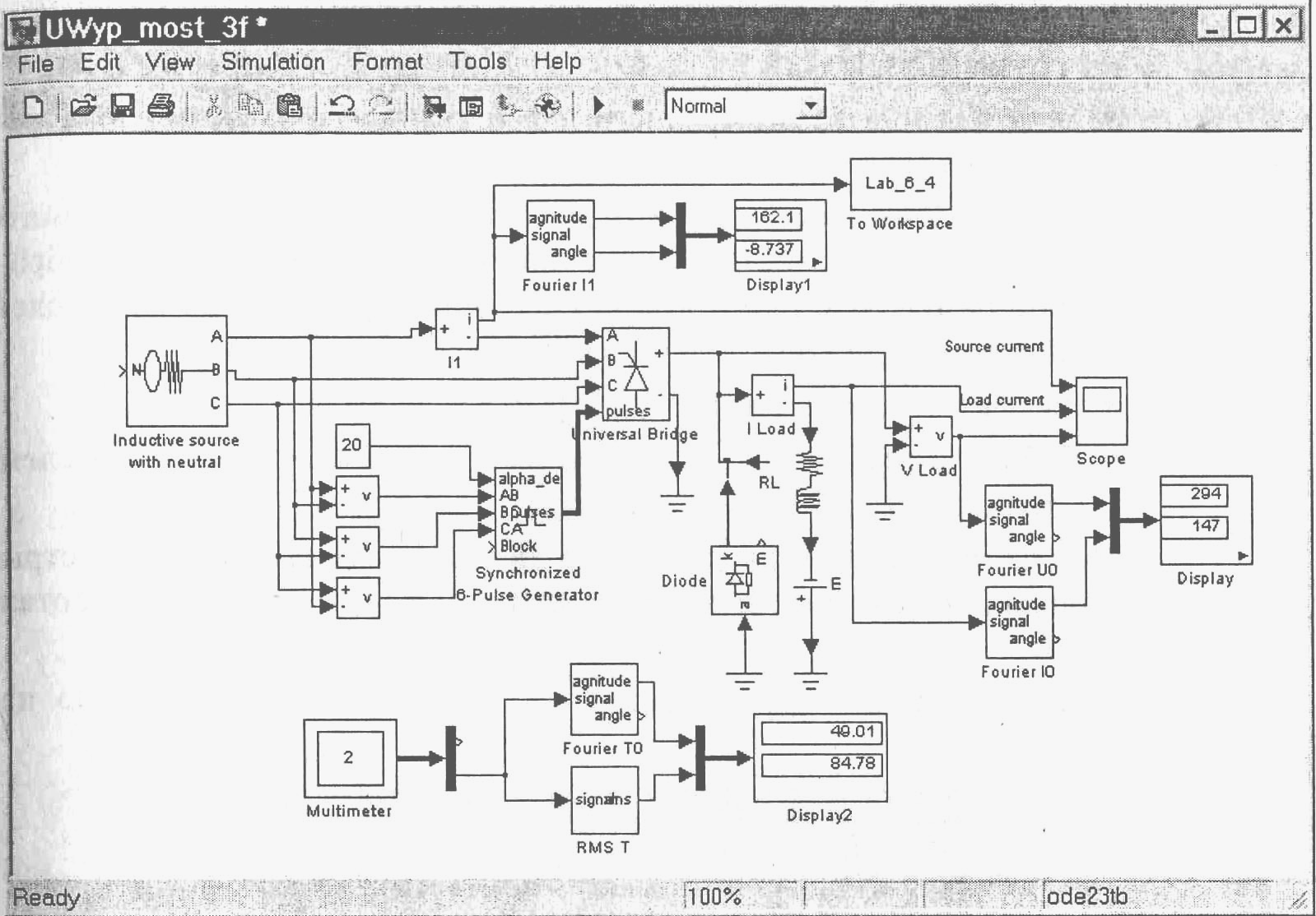 • блок для измерения гармонических составляющих тока нагрузки (Fourier I0) и аналогичный блок для измерения гармонических составляющих напряжения на нагрузке (Fourier U0);
