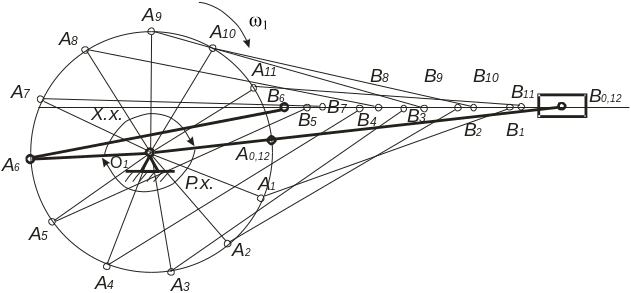 2.1.5. З точки O1 радіусом O1А проводимо коло – траєкторію руху точки А кривошипа. На перетині кола з лінією O1В0 отримаємо точку А0. Лінія, що проходить через точки O1, А0 та В0, показує механізм у крайньому (або нульовому) положенні. Тут повзун займає найбільш віддалене положення, а кривошип та шатун розташовані на одній лінії (див. рис. 2.1).