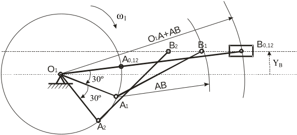 Відкладаємо кут 30º від O1А0 у напрямку кутової частоти обертання кривошипа ω1 (напрям задається викладачем) і на лінії кола одержуємо точку А1. Проводимо радіус O1А1 і з точки А1 колом радіуса АВ перетинаємо лінію траєкторії руху повзуна. Отримана точка B1 показує перше положення повзуна. Таким чином будується перше положення механізму.