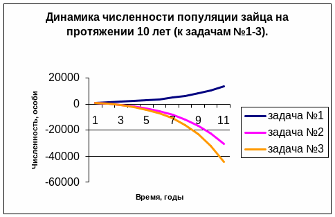 При отсутствии хищников количество особей в популяции стремительно растет ( задача №1), так как рост численности зайцев ничем не сдерживается.