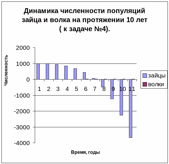 Обратим внимание на то, что несмотря на полное вымирание зайцев через 7 лет , количество хищников продолжает увеличиваться. Поскольку в условии ничего не сказано относительно других жертв волка, можно считать зайца единственной жертвой. Тогда рост численности хищников в отсутствии пищи объясняется ошибкой в построении модели.
