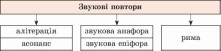Алітерація - повтор одного або кількох приголосних звуків у суміжних або розташованих недалеко одне від одного словах. Наприклад: У полі спить зоря під колоском і сонно слуха думу колоскову, і сонна тиша сонним язиком шепоче саду сиву колискову (М. Вінграновський). У цьому прикладі алітерація звука [с] підкреслює спокій природи.