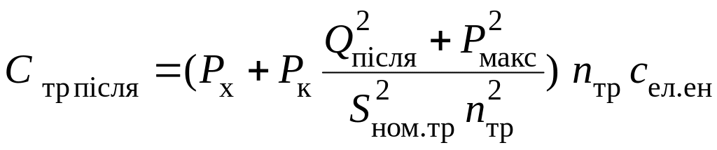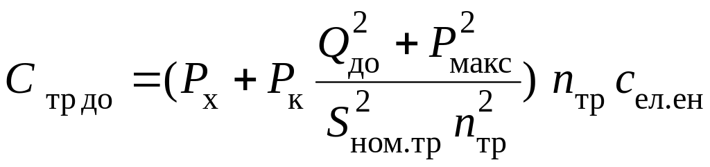 де Pх втрати холостого ходу (Вт); Pк втрати короткого замикання (Вт); Sном.тр номінальна повна потужність трансформатору (ВА); nтр кількість паралельно підключених трансформаторів ГПП;