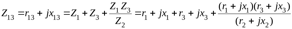 Схему на рис.7 можна розрахувати шляхом перетворення зірки опорів у трикутник і отримати схему, в якій кожне джерело живлення напряму з'єднане з точкою короткого замикання: