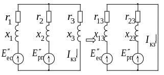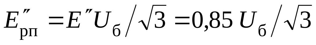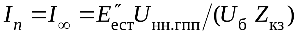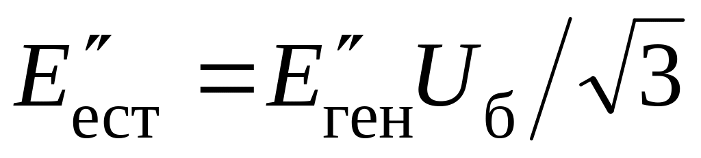 де Eген надперехідна ЕРС генератора у відносних одиницях (для турбогенераторів потужністю до 100 МВт Eген = 1,08 в.о.; для турбогенераторів потужністю більше 100 МВт Eген = 1,13 в.о.);