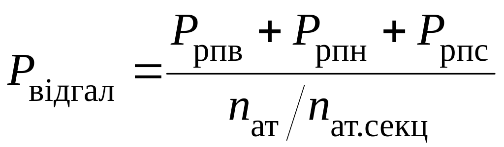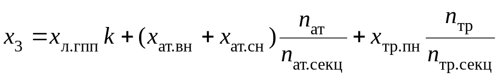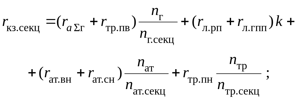 де nг та nг.секц відповідно загальна кількість генераторів на електростанції та їх кількість, що живить районну підстанцію (nг / nг.секц ≥ 2); k = 2 кількість гілок ЛЕП; nат та nат.секц відповідно загальна кількість автотрансформаторів (або трансформаторів) на районній підстанції та їх кількість, що живить ГПП (nат / nат.секц ≥ 2); nтр та nтр.секц відповідно загальна кількість трансформаторів на ГПП та їх кількість в одній секції (nтр / nтр.секц ≥ 2). Зазвичай nат = nтр = 2, тоді nат.секц = nтр.секц = 1, але можливі й інші співвідношення, що залежить від результатів контрольної №1.